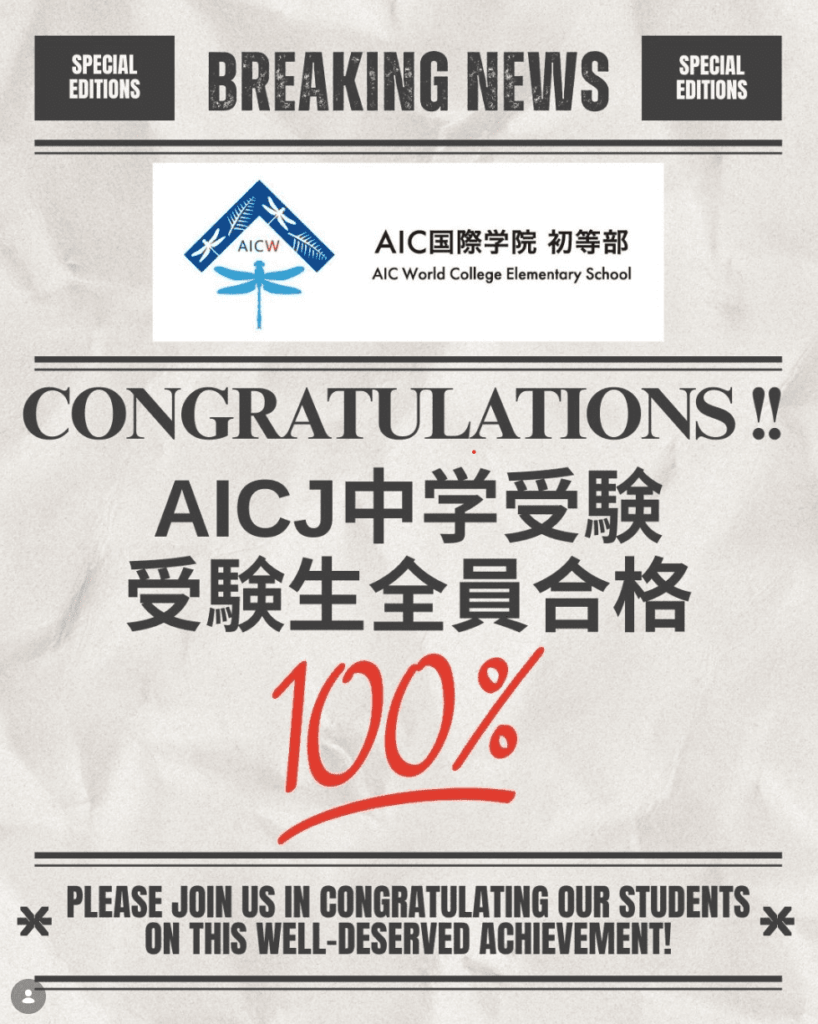 国内進学を希望した児童は、**AICJ中学校(AICJ Junior High School)**を第一希望として受験、第一希望校合格率100%を達成することができました。