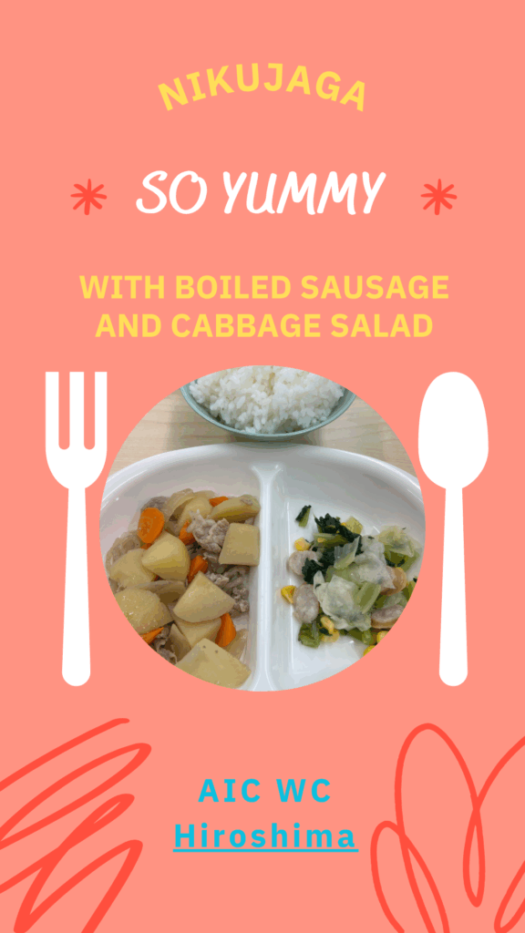 本日のAIC WC初等部広島校の給食は、広島産の採れたてオルガニック野菜を使った肉じゃが(豚肉)と温野菜サラダでした🥕🥔🧅🍖