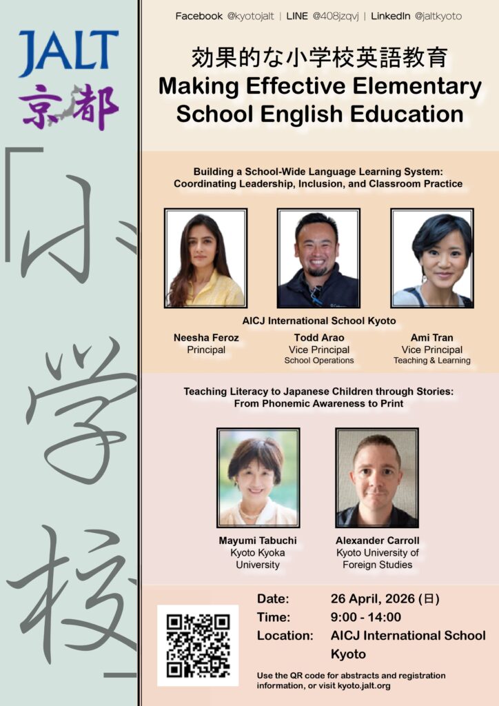 本校の教育リーダーシップチームによる、JALT京都での発表予定についてお知らせいたします。